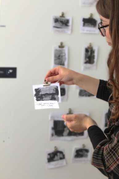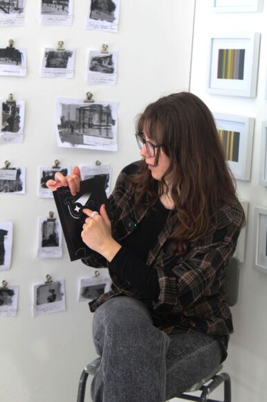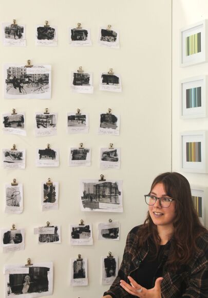 Viktoriia Domushchi talks through her branding, sitting in front of her A Level Photography pieces at the Torch exhibition. Photo: Hannah Pycroft, Holy Cross Graphics and Photography student (Year One)